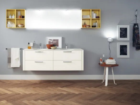 Décorez parfaitement la salle de bien-être moderne avec des fontes en verre laqué blanc mat, des meubles de salle de bain suspendus et des objets en verre de Scavolini Bathrooms.