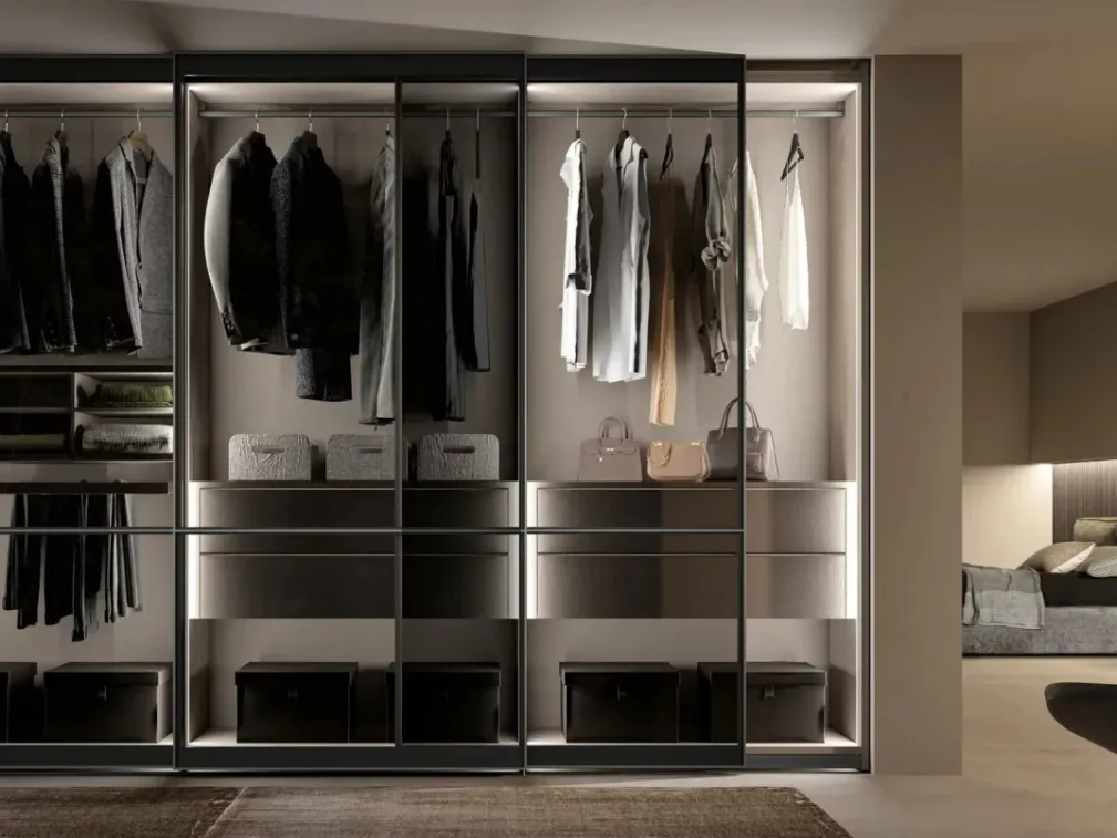 Les placards muraux avec portes coulissantes sont des éléments indispensables dans la chambre pour la rendre meublée au mieux, fonctionnelle et complète. Contactez-nous et obtenez des informations sur notre ligne de mobilier de maison : vous aurez la possibilité de compléter la chambre en ayant accès à une large gamme de meubles de rangement modernes, tels que l'armoire en verre sur l'image. Pour meubler parfaitement une pièce fonctionnelle et esthétiquement agréable, optez pour les solutions les plus exclusives des meilleures marques, lits, armoires et tables de chevet au contenu esthétique élevé.