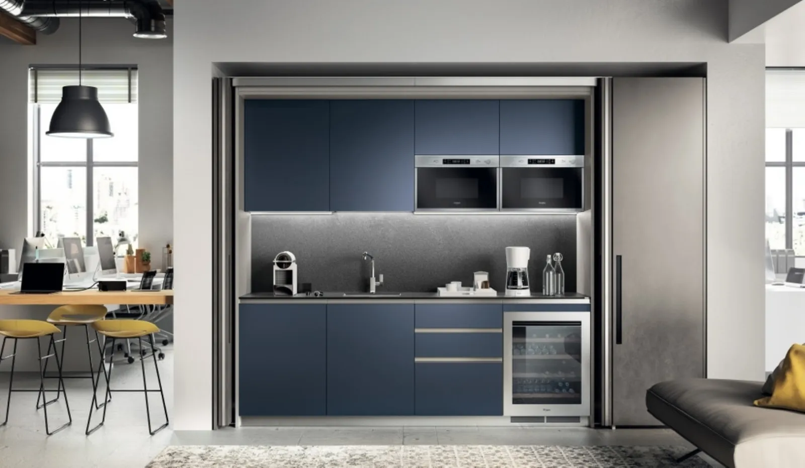 Cliquez et obtenez des informations sur les cuisines sur mesure monobloc gain de place réalisables : voici le modèle Boxi 09 de Scavolini!